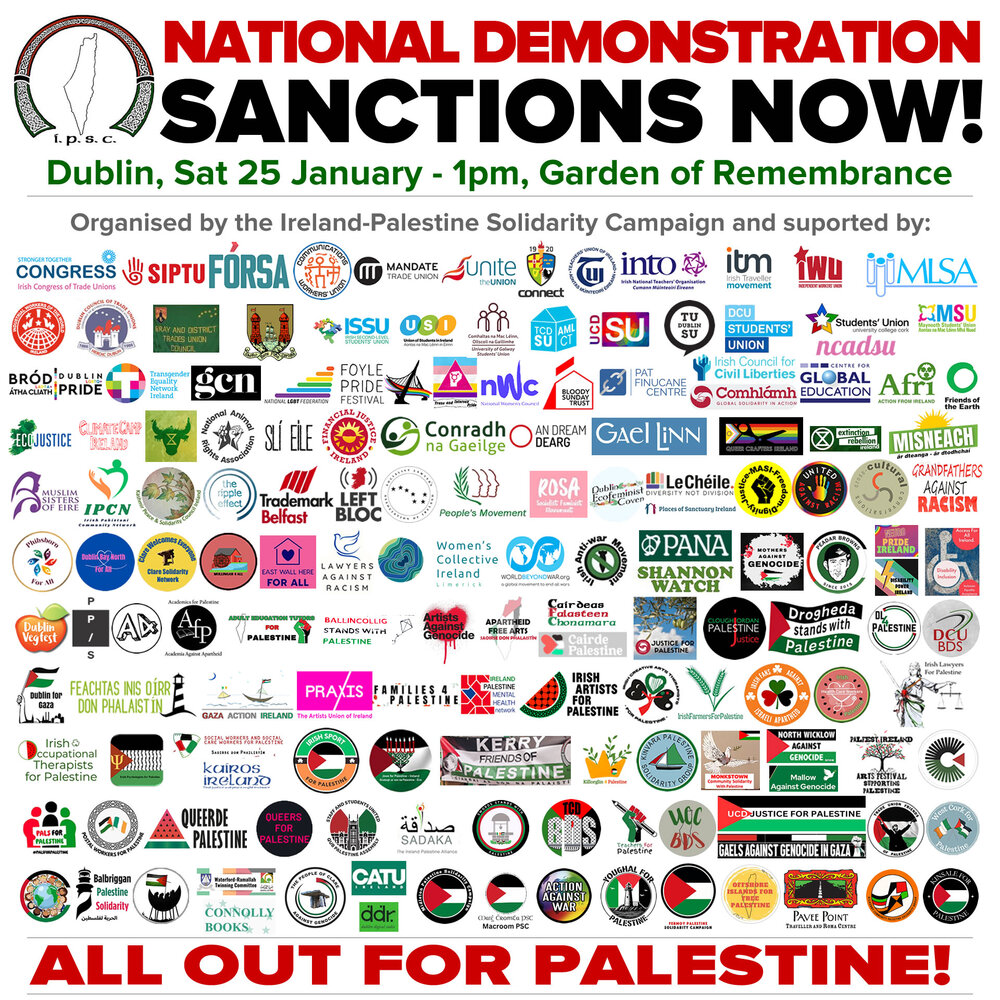 Come join the Fórsa contingent at the first national demonstration for Palestine of 2025. The march will take place on Saturday 25th January at 1pm. Protestors will gather at the Garden of Remembrance and march to the Molesworth Street rally point, outside the Dáil.