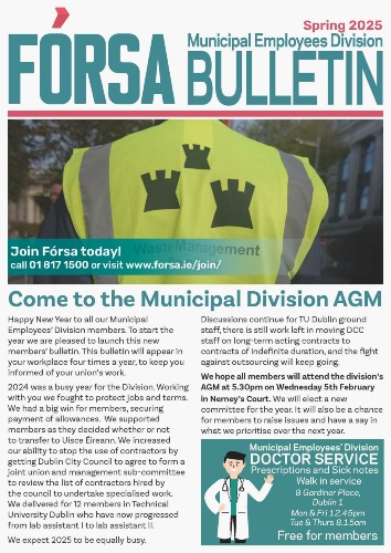 In our first issue we invite members to attend the divisional AGM on 5th February. We have an update on the fight for remunicipalisation of waste services, and we talk about importance of being part of Dublin City Council’s upcoming workforce planning.