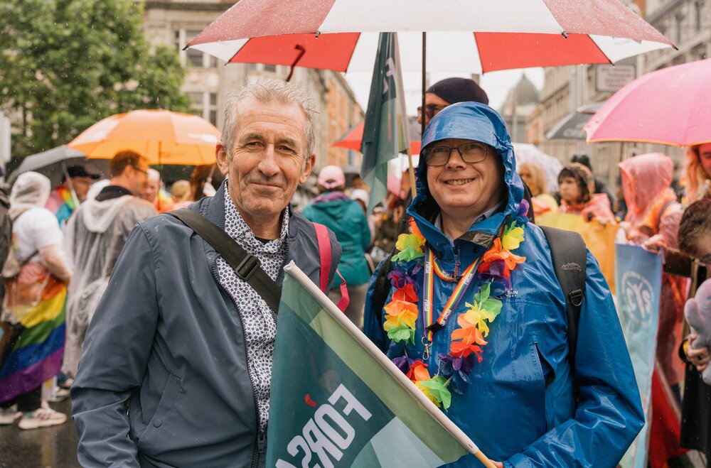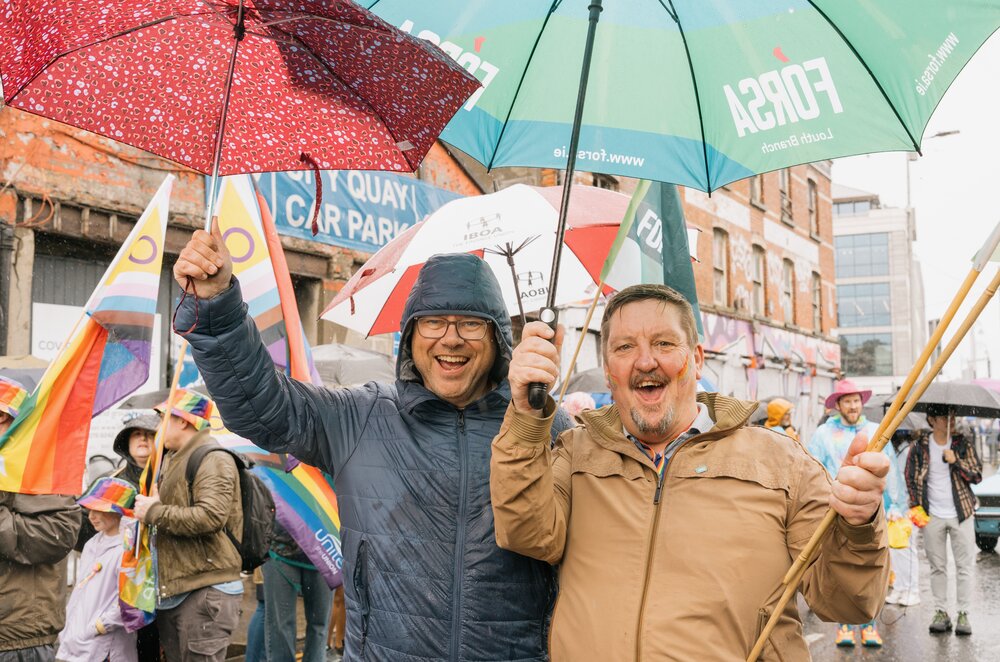 A festive atmosphere reigned when members assembled on O’Connell Street, in defiance of the torrential rain, with rainbow colours only slightly muted by the clear plastic of ponchos. The union group was joined by Fórsa president Martin Walsh, and general secretary Kevin Callinan.