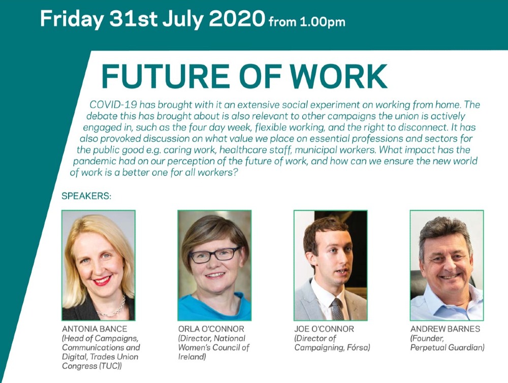 The final session in Fórsa’s summer series of webinars on campaigning issues takes place at 1pm today (Friday 31st July), when a panel of experts discuss the future of work.
