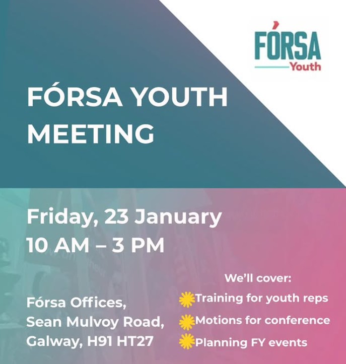 The next Fórsa Youth meet up will take place on Thursday 22nd January in Galway, followed by a meeting on Friday 23rd January in Fórsa’s office in Galway. The meeting will focus on Fórsa Youth motions for the biennial conference, plan the year’s schedule of events, and discuss further training for youth reps.