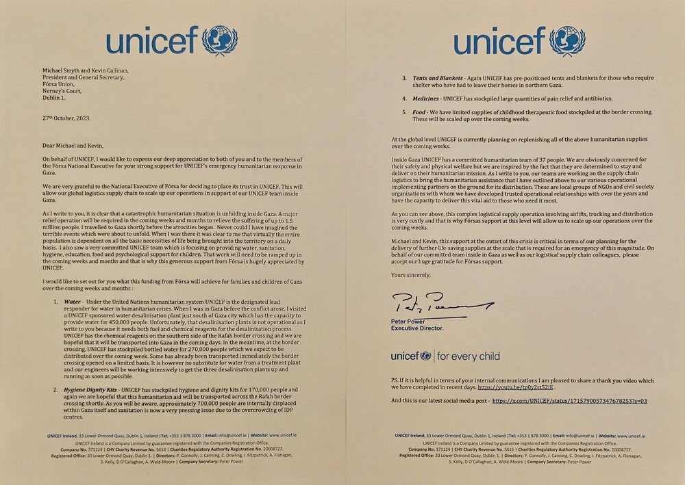 Acknowledging the donation, UNICEF executive director Peter Power thanked Fórsa and outlined where the funding would be directed in the coming weeks and months, including the provision of urgently needed water, hygiene dignity kits, tents, blankets, medicines and food.