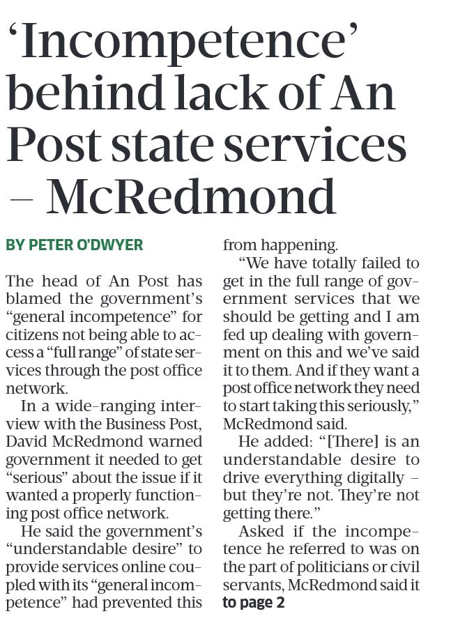 The competing agendas of DPER and An Post on this issue surfaced in the media a few months ago. DPER is focused on its digital strategy (for example Revenue), while An Post is looking to cater to the 'offline citizen'. Both parties have resorted to collectively slagging off civil servants in their exchanges. Not a good look fellas. In a longer interview in the paper, An Post chief David McRedmond says while things have improved at An Post, the company's not in 'a safe place'.