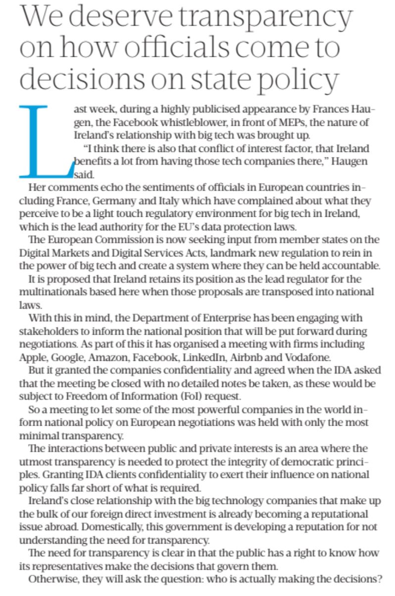 The Post's editorial focuses on transparency in state policy as the paper reports a clutch of multinational tech firms sought and were granted confidentiality before meeting a government minister to discuss Ireland’s position on new EU legislation designed to rein in those same digital companies.