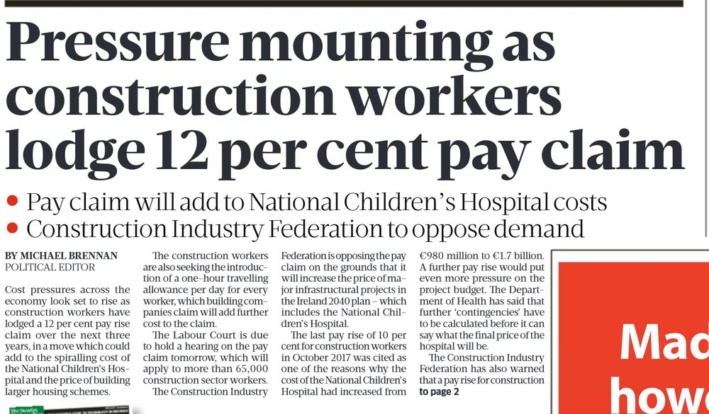 Yesterday's Sunday Business Post included substantial coverage of its successful defence of a defamation claim by the businessman Denis O'Brien, but its front page story was about a 12 per cent pay claim lodged by construction workers (previously reported in last week's edition of Industrial Relations News), while the Central Bank has expressed concerns that the state's help-to-buy scheme "is now effectively acting as a subsidy to builders."