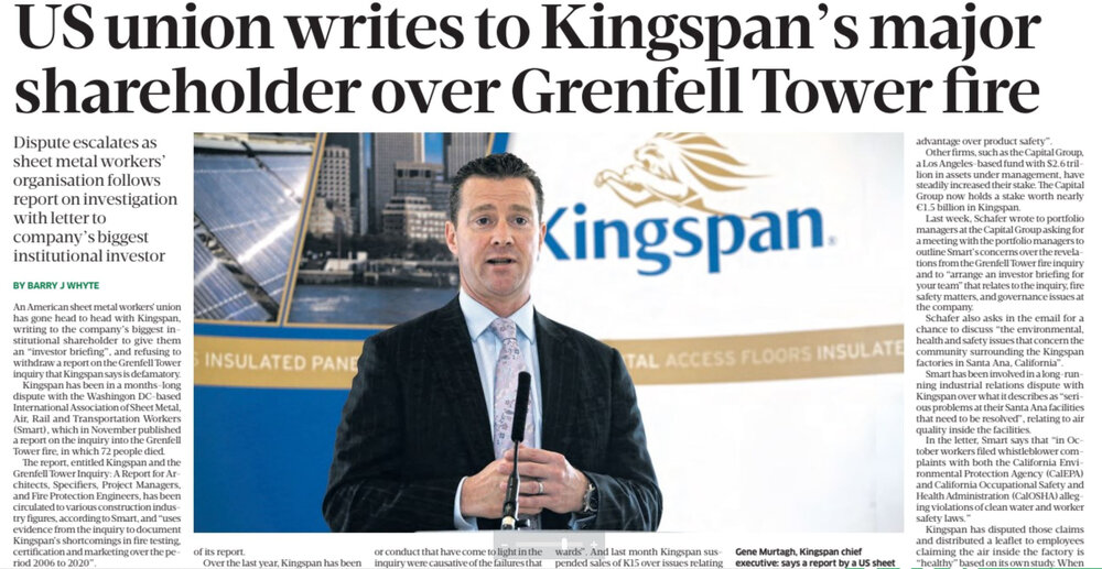 The Post also reports on a row between an American sheet metal workers’ union and Kingspan. The International Association of Sheet Metal, Air, Rail and Transportation Workers (Smart) has refused to withdraw a report on the Grenfell Tower inquiry that Kingspan claims is defamatory.