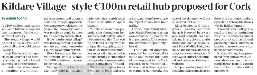 The same paper reports that in Cork, plans are afoot to answer a question nobody was asking, as developers look to build a Kildare Village-type outlet outside the only city in the country that still boasts a thriving independent retail sector in its city centre. The worst idea I've heard since the abandoned plan to repatriate the bones of James Joyce.