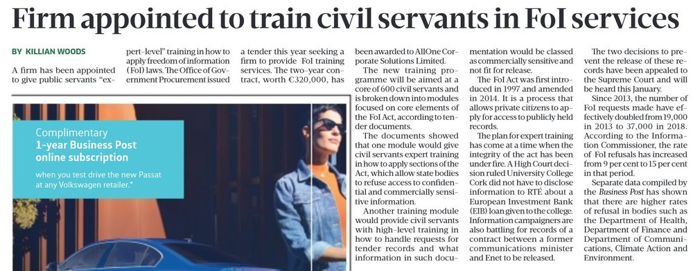 The paper frmerly known as the Sunday Business Post (as of this week it has dropped 'Sunday' from its masthead) reported yesterday that a firm has been appointed to deliver expert training on the handling of Freedom of Information (FoI) queries to civil servants.