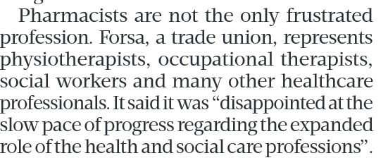 In yesterday's Sunday Business Post, Susan Mitchell included this reference to Fórsa's criticism of slow progress on expanding the role of HSCPs, in an article headed The Silent Majority of Health Betrayals (page 6). The full article is available from the Communications Unit upon request.