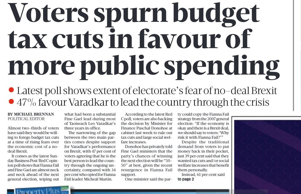 Meanwhile, the front page of the Sunday Business Post reported that polling shows voters would prefer investment in public services to tax cuts, as Brexit fears loom large, while the paper's editorial warns on the effects of the rising cost of living.