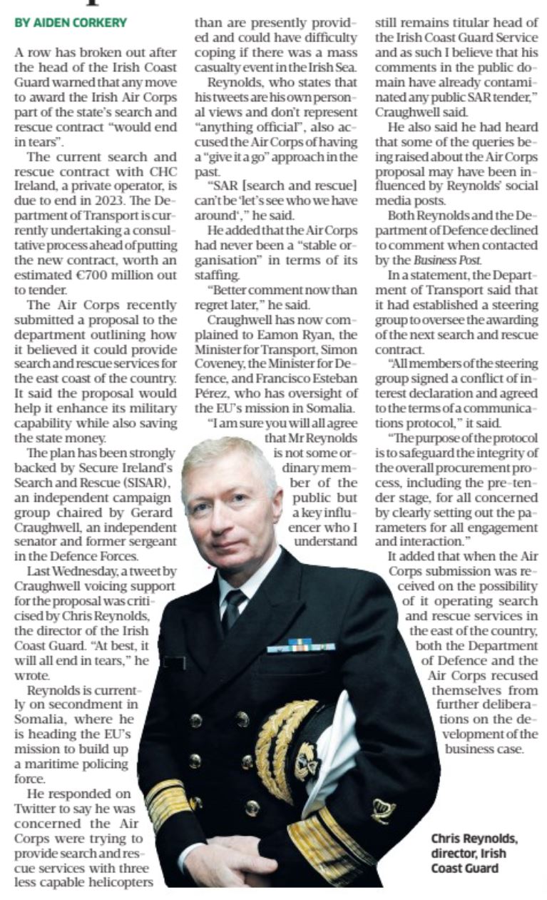 Elsewhere, IALPA vice-president Joe May writes in the letters page of Saturday's Irish Times that the Government must "provide the necessary supports and plan for recovery for aviation in Ireland before the hard-won gains of the last decade are wiped out forever." In other aviation news, the Business Post reported yesterday on concerns expressed by the Irish Coast Guard about the future of the service if parts of the service are taken over by the defence forces. The current contract with CHC expires in 2023, and the service is due to be put out to tender.
